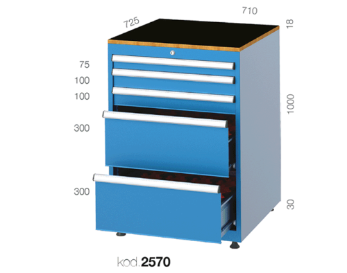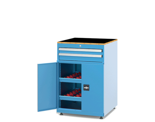 CNC Tool Storage Cabinet main body made of 1,20mm thick DKP metal. Drawers have 600x600mm net usable interior surface. Contains central locking mechanism and anti-tilt mechanism. 75kg load capacity per drawer. Heavy duty robust body frame welded and has vertical reinforcements on each 4 corners. Totally 40 CNC morse taper holder on 2 pull-put shelves. Coated with electrostatic powder paint. Drawer sliders made of 2,50mm HRP metal and run on 6201zz ball-bearings. Drawer interior walls have metal separator slots in each 17mm to organise partitions properly with EK standard. Cupboard door has 2 points locking with key. Black laminated chipboard on top. Includes adjustable feet for uneven ground surfaces.