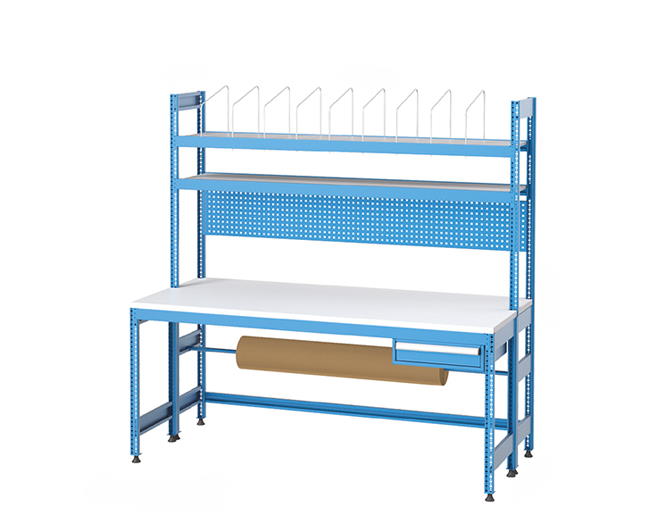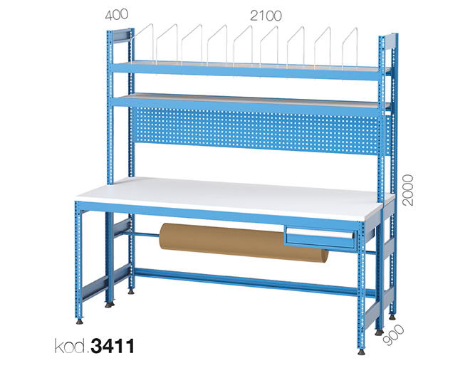 6 twisted legs and connecting arms of our workbenches that can be disassembled are produced from 2 mm dkp sheet with electrostatic powder paint. Behind the table, there is a tool hanging board produced from 1,20 mm dkp sheet with 10×10 square holes. 30 mm White Laminated Chipboard used as the table top. There is 1 roll rack under the table. The main body of our chest of drawers used under the table is made of 1,20 mm dkp sheet. The product has 1 drawer with internal net usage area of 440×440 mm. There are 2 fixed shelves 400×2000 mm at the top, the top shelf is with a separator. Parcel and packaging material can be placed. Special pressed rubber shoes are used to prevent scratching the floor.