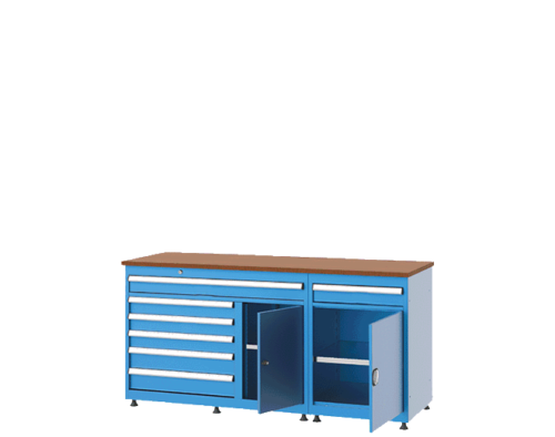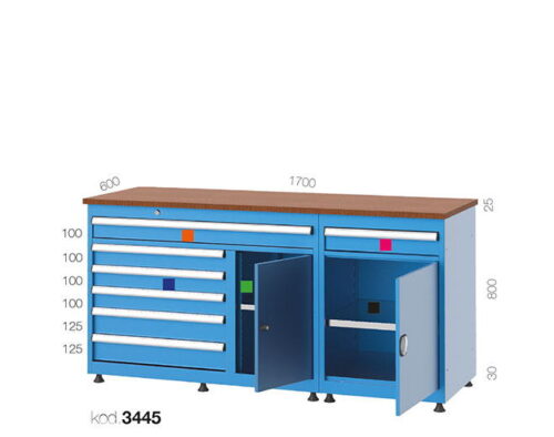 The main bodies of our chest of drawers, which are used in our long type bank, are produced with solid steel construction welded from 1,20 mm dkp sheet. There are 5 internal usage areas 600×450 mm, 1 internal usage area 450×450 mm, 1 internal usage area 1020×450 mm drawers. The interior of the drawer has a metal separator channel with an adjustable pitch of 17 mm. Anodized aluminum profiles are used in the drawer handles. There are 2 cupboards with half doors. Cabinets have 1 galvanized shelf, each of which can be adjusted in height. There are m12 ball joint adjustment screws underneath. Table top tray is 25 mm MDF. There are m12 ball joint adjustment screws under the table.
