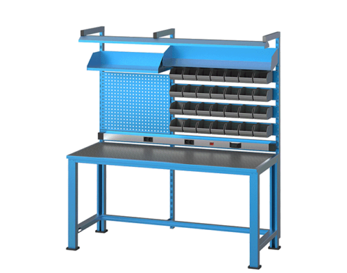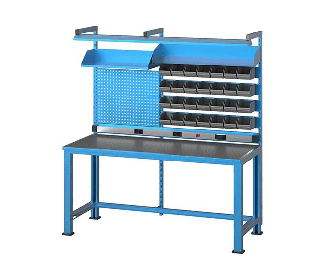 Workbench model frame made of 2,00mm thick DKP metal sheet strengthened with 6 bendings. Suitable for knockdown packaging. Coated electrostatic poweder paint. 2,00mm ESD mat coated 25mm MDF worktop as standard. ESD mat comes with earthing cable and anti static wrist band. Includes power bar with 4 outlets, tool panel, file folder shelf and fluorescent lighting system. Includes rubber shoes to prevent floor scratching.