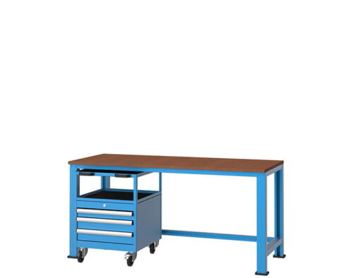 Workbench model frame made of 2,00mm thick DKP metal sheet strengthened with 6 bendings. Suitable for knockdown packaging. Includes tool cart for hand tools and miscellaneous items storage. Coated electrostatic poweder paint. 25mm MDF worktop as standard. Includes rubber shoes to prevent floor scracthing. Tool cart body made of 1,20mm DKP metal sheet. Heavy duty robust body frame welded and has vertical reinforcements on each 4 corners. Drawer sliders made of 2,50mm HRP metal and run on 6201zz ball-bearings. Drawer interior walls have metal separator slots in each 17mm to organise partitions properly with EK standard. 450x450mm net usable interior surface. 75kg load capacity per drawer. Drawer handles made of aluminum. Contains central locking anti–tilt mechanisms. Caster set consist of 2 fixed, 1 swivel and 1 swivel with brake 100mm rubber wheels.