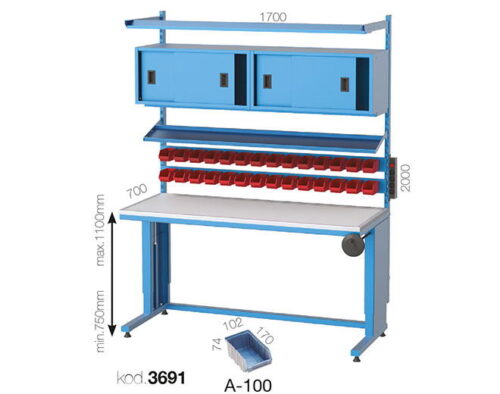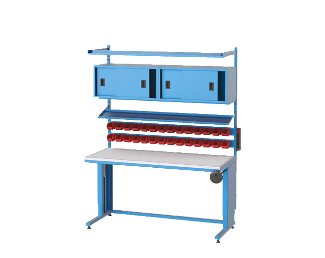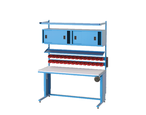 The frame of our electronic workbenches is produced with 30×60 box profile and 4 twisted legs with 2 mm dkp sheet, electrostatic powder painted. The table height of our workbench can be raised and lowered from 750 to 1100 mm from the floor. It is 2 mm ESD board on 25 mm MDF as the table top. Ground wire and wristband are provided with ESD plate. There is a sliding folder cabinet, material shelf, 2 rows of tool shelves and fluorescent on the top of the table. The workbench has a four grounded socket with switch. Ball joint feet are available to adjust the floor under the counter.