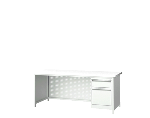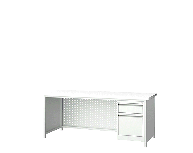 Foremen & Supervisor Work Table model frame made of 1,50mm thick 35x35mm metal box profile, welded robust structure. Coated with RAL7035 light grey color electrostatic powder paint. 30mm thick white laminated chipboard worktop.Includes 1 drawer and 1 cupboard. 3 sides closed with perforated metal. Includes rubber shoes to prevent floor scratching.
