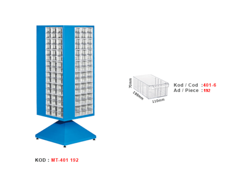 192 Plastik çekmeceli kutulu, dört yönlü dönen metal gövdeli dolap